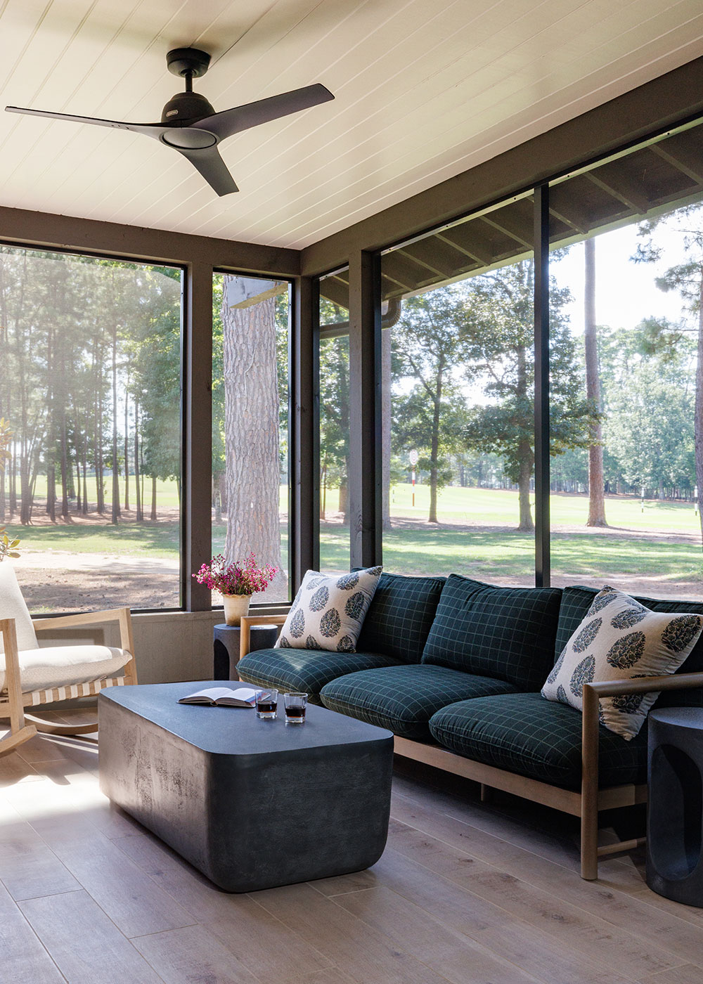 The Cottage was designed to create warm, inviting spaces both indoors and out. The outdoor area drew inspiration from the clients’ love of plaid, featuring a green plaid sofa as the focal point, complemented by patterned accent pillows and rocking chairs perfect for morning coffee or evening wine. Indoors, the living room served as a versatile family gathering space, with a low-profile coffee table, spacious sectional, and cozy performance fabrics in warm tones, blending comfort, functionality, and style for everyday living and playful moments.