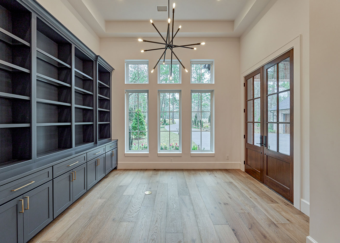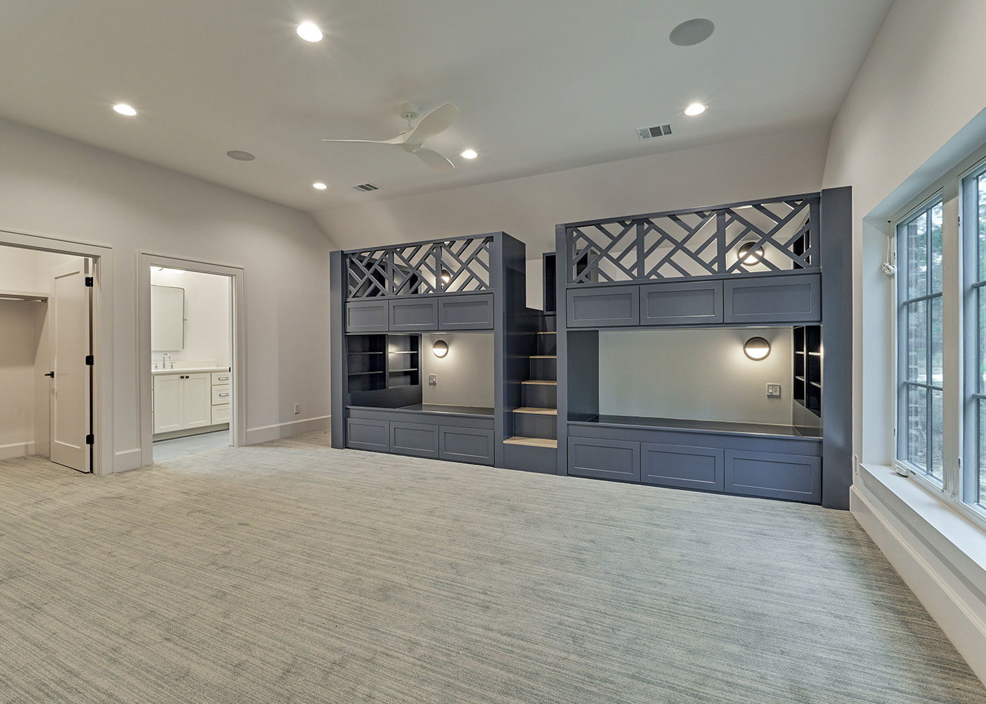 Tucked away on 1.53 acres in a serene cul-de-sac at Bluejack National, this custom residence offers an ideal blend of privacy, comfort, and resort-style living. The home features three spacious bedrooms plus a bunkroom, complemented by five and a half bathrooms, designed to accommodate family and guests with ease.