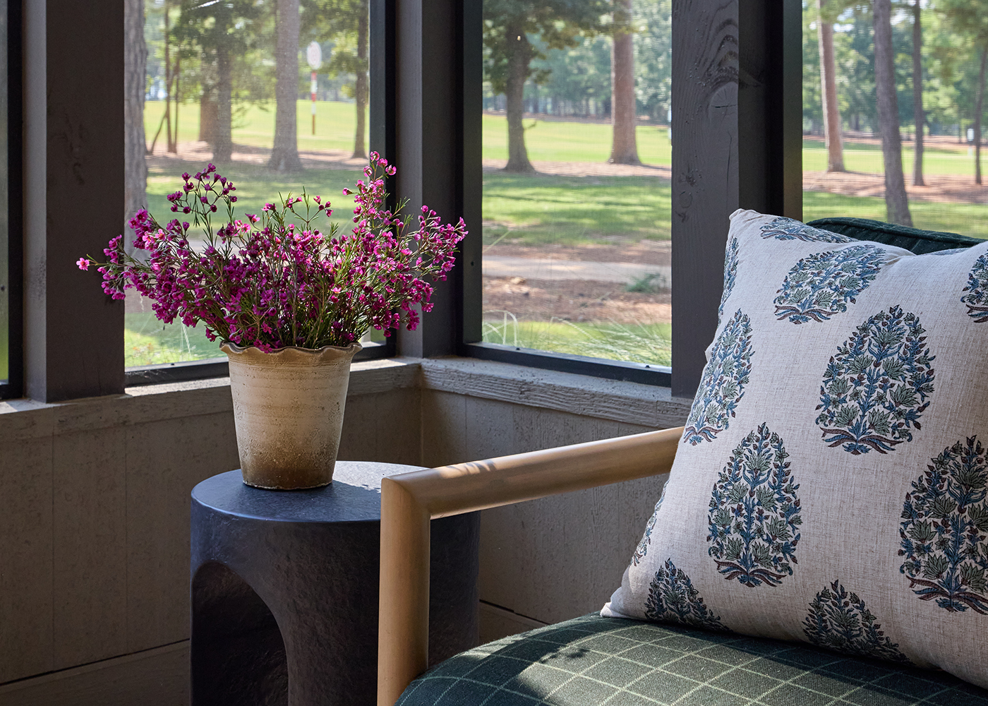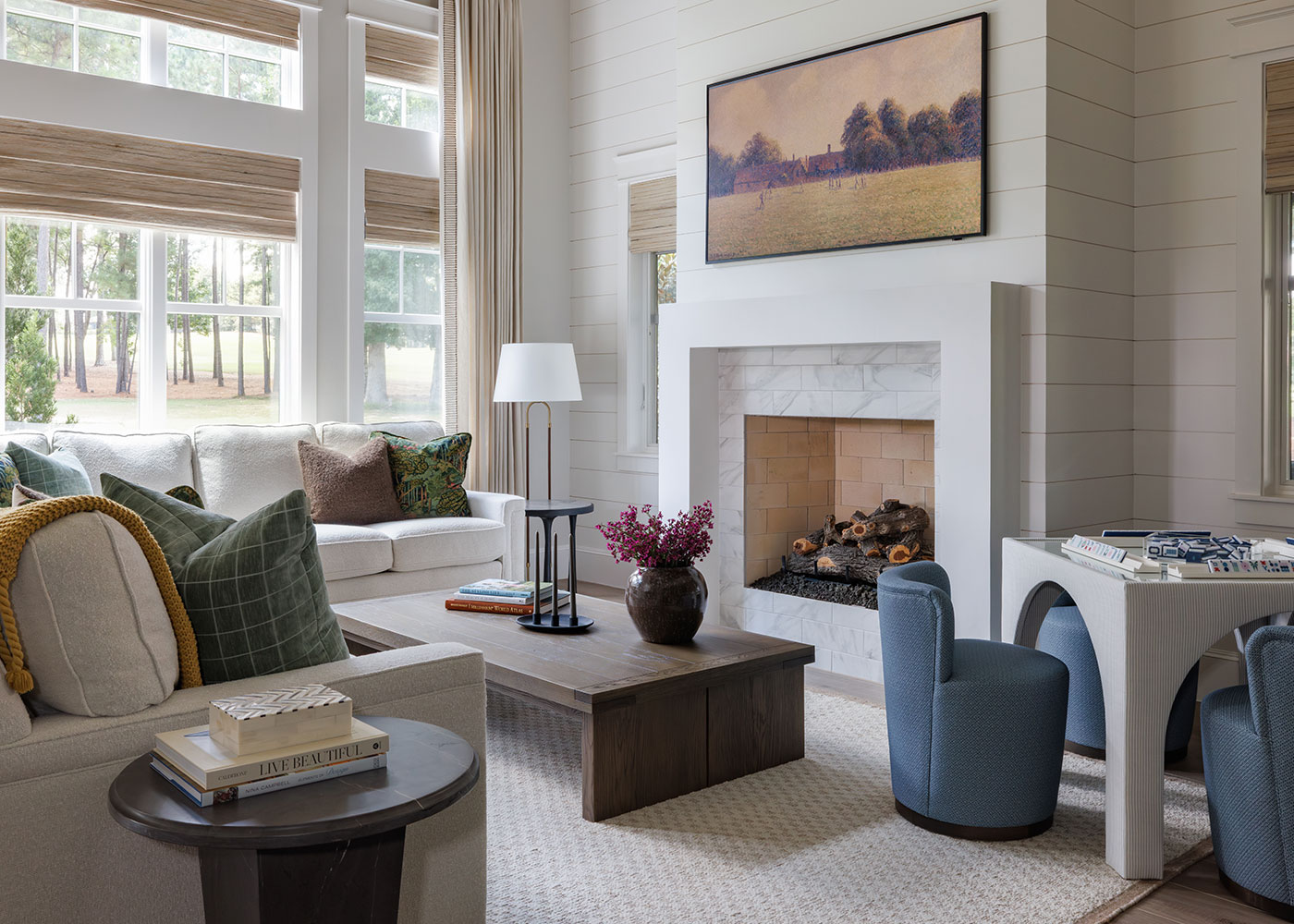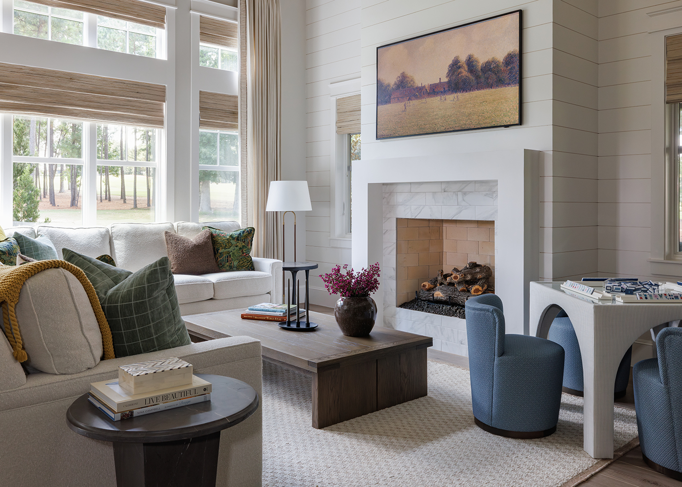 The Cottage was designed to create warm, inviting spaces both indoors and out. The outdoor area drew inspiration from the clients’ love of plaid, featuring a green plaid sofa as the focal point, complemented by patterned accent pillows and rocking chairs perfect for morning coffee or evening wine. Indoors, the living room served as a versatile family gathering space, with a low-profile coffee table, spacious sectional, and cozy performance fabrics in warm tones, blending comfort, functionality, and style for everyday living and playful moments.